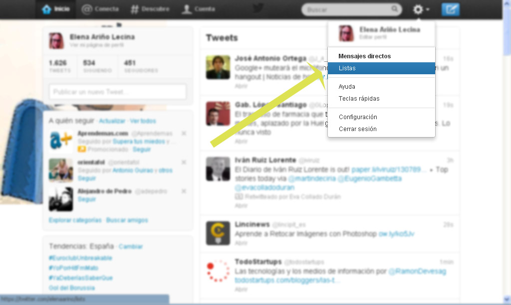 Cuando ya empiece a tener una cantidad interesante de gente es muy útil crear listas para no liarte en exceso. Con estas listas puedes organizarte contactos por áreas de interés concretas, profesionales específicos, medios de comunicación… Para crear una lista deberás irte al menú y seleccionar listas: