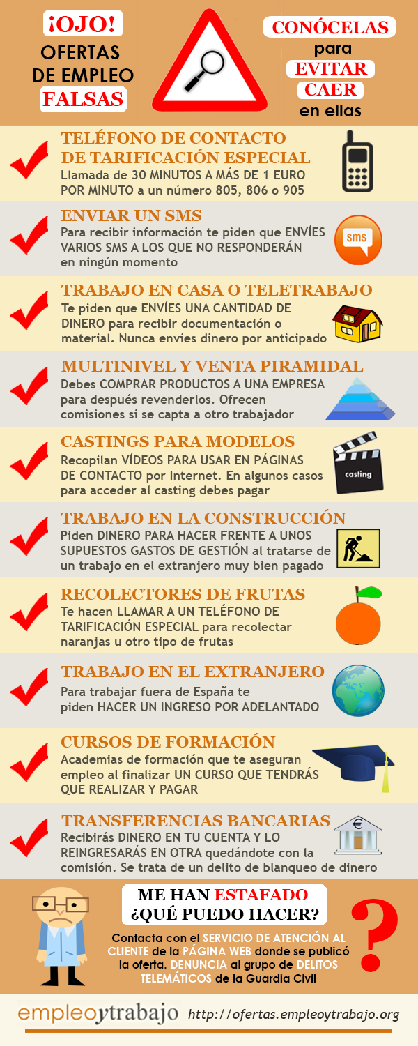 Independientemente de la vía que utilicemos para buscar empleo, deberemos partir de una simple y llana premisa: si una oferta de trabajo es demasiado buena, es falsa.  No nos creamos cualquier cosa, ni tampoco nos lancemos a cualquier oferta en la que no pidan nada.  Una oferta de trabajo tiene que dejar claro qué puesto de trabajo están ofreciendo y qué piden para poder desarrollarlo.  Si no son claros, no te fíes.  En la web de finanzas.com nos dan cinco claves para saber cómo reconocer ofertas de trabajo falsas: