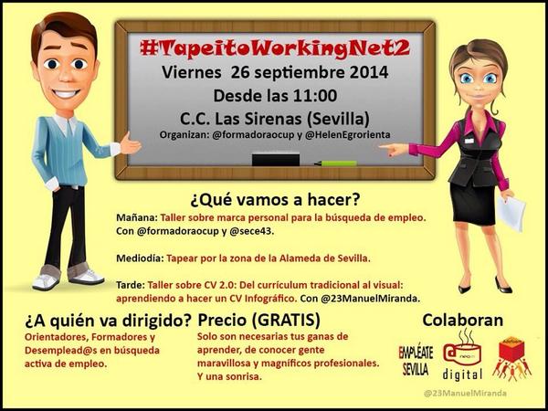 Como ya sabéis, desde plandempleo.com estamos buscando eventos e iniciativas de empleo para ayudar en lo posible en su difusión. Hoy os presentamos el Tapeito Working Net 2, organizado e ideado por Luisa Sánchez Miranda y Helen Gómez y que se va a llevar a cabo en el Centro Cívico Las Sirenas de Sevilla el próximo viernes 26 de Septiembre a partir de las 11.00 horas. Si quieres saber en qué consiste y a sus organizadoras, sigue leyendo…